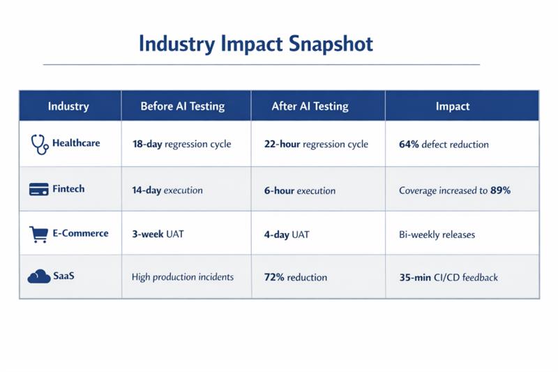 The value of AI-driven testing is not theoretical. Organizations across healthcare, fintech, e-commerce, and SaaS have documented measurable improvements after modernizing their QA approach.